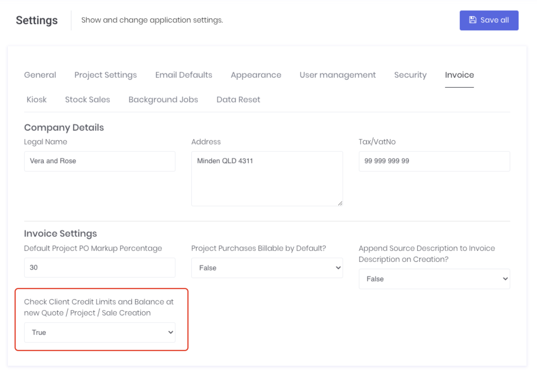 To enable credit limits, first ensure that the checks are enabled in your invoice settings (Administration -> Settings -> Invoice). Set the Check Client Credit Limits and Balance at new Quote / Project / Sale Creation dropdown to True