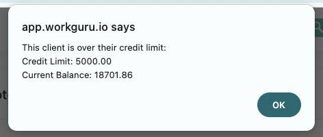 Client credit limits allow you WorkGuru users to be notified if a client's current account balance is currently over the nominated limit when the following transaction are created: