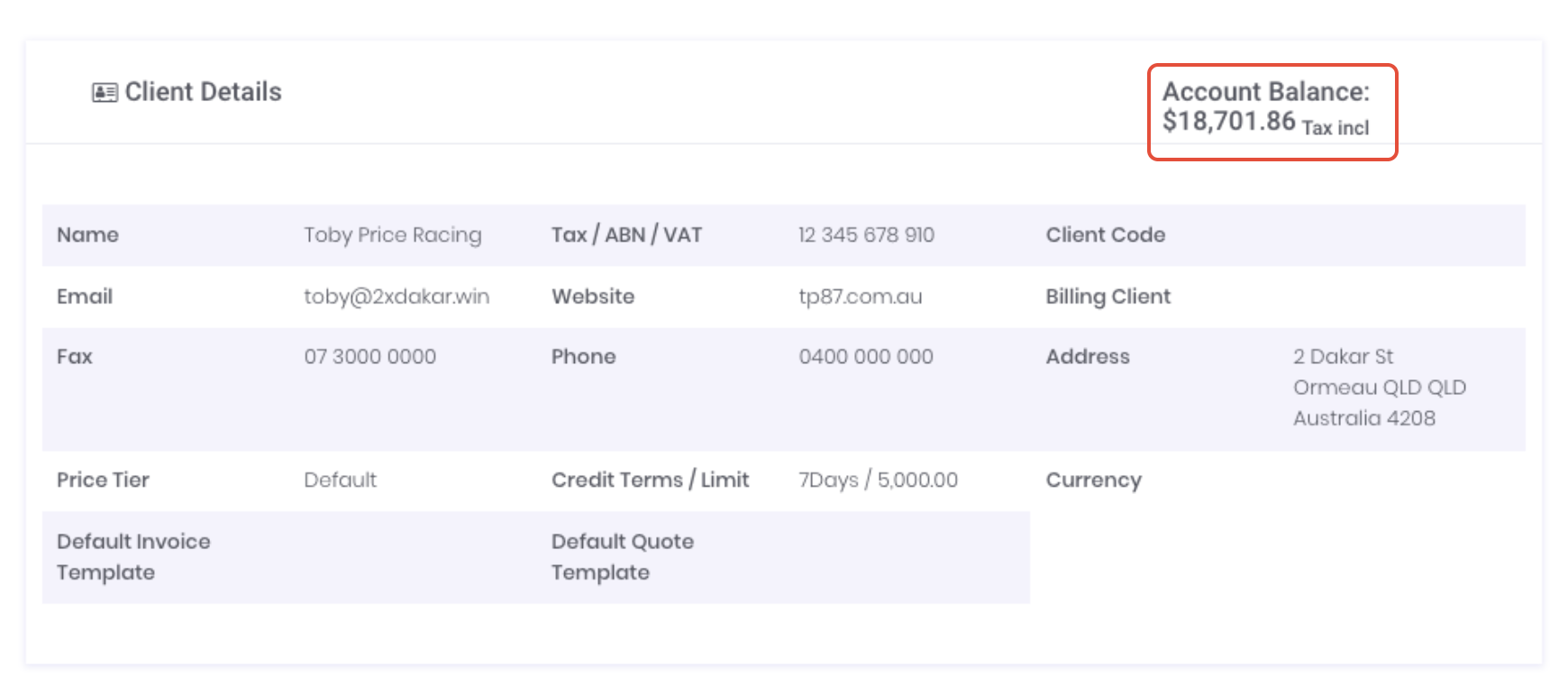 Note: The account balance in WorkGuru is based only on invoices and payments raised and applied in WorkGuru. It may not match the client's true account balance, which is managed in the connect accounting integration.